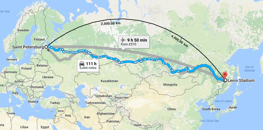 On Sunday, Roberto Mancini’s Zenit St. Petersburg makes the trip way out east. By air, it’ll take the team about 7.5 hours. But if fans want to travel to the game by car, the journey will take 111 hours over 5,442 miles, crossing seven time zones.