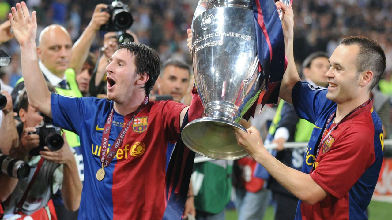 Messi and Iniesta hoist the 2009 Champions League trophy.